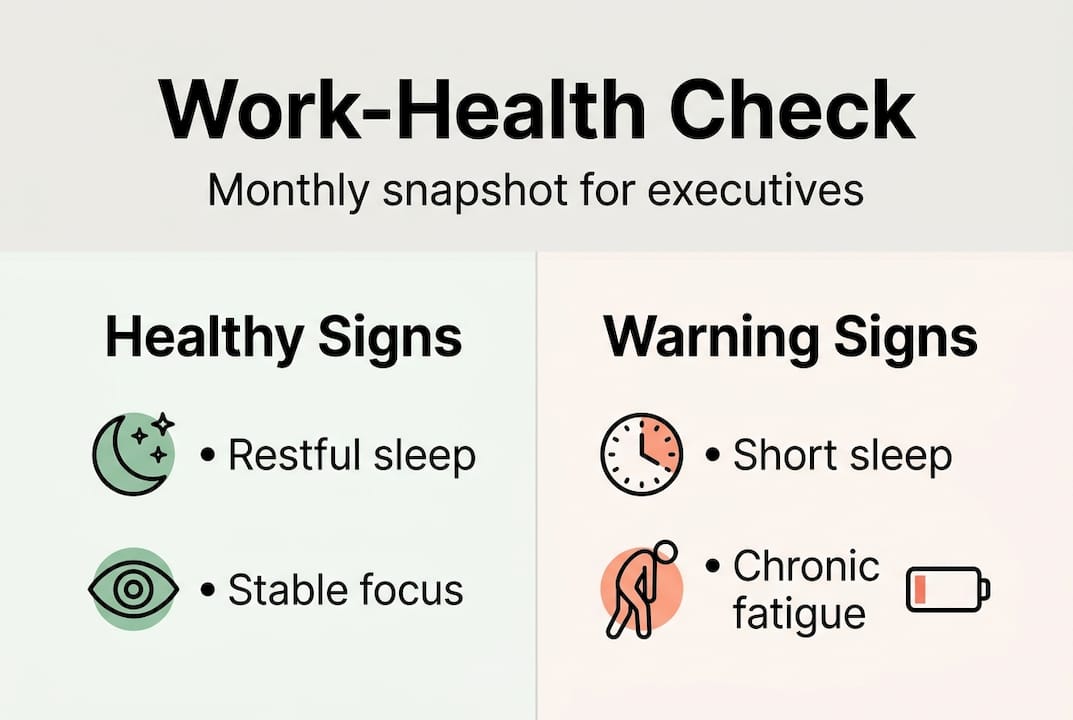 Healthcare CEOs report chronic fatigue, frequent illness, and strained relationships as early indicators of burnout-linked imbalance. Irritability and declining focus during routine tasks are also reliable early signals.