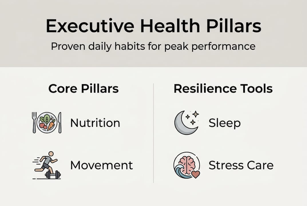 Most executives don't fail at health because they lack discipline. They fail because they follow generic advice built for average people with average schedules. The pillars that actually work for high performers are well-established: plant-rich nutrition, regular physical activity, prioritized sleep, mindfulness practices, strong social ties, and a clear sense of purpose. Harvard's research on healthy lifestyle routines confirms these six anchors reduce chronic disease risk by up to 80% when practiced consistently.