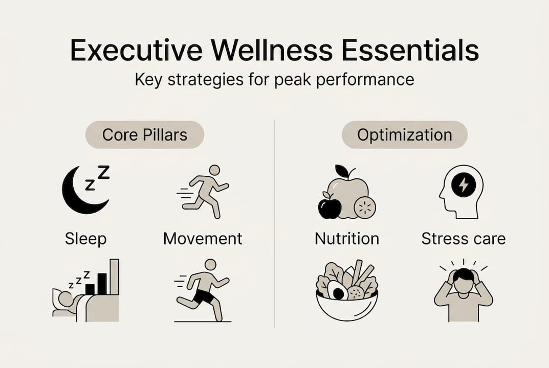 Burning out at the top isn't a badge of honor. It's an avoidable liability that quietly erodes your decision-making, shortens your runway, and compounds into serious health risk. The executives who sustain peak performance into their 50s and 60s aren't working harder than everyone else. They're working smarter on their biology. Sleep, movement, nutrition, and breathwork form the pillars of long-term health for leaders, and the men who treat these as non-negotiable investments consistently outperform those who don't. This guide gives you the protocols, frameworks, and metrics to build a wellness system that scales with your ambitions.