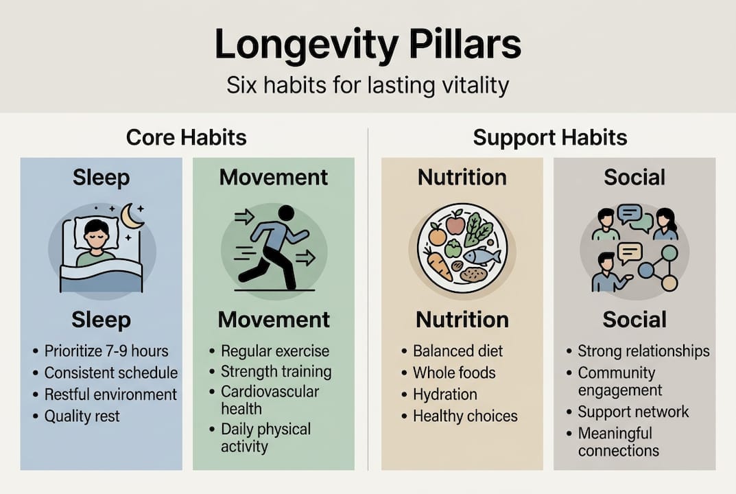 | Science-backed pillars | The core drivers of longevity are sleep, movement, nutrition, stress handling, and social connection. |