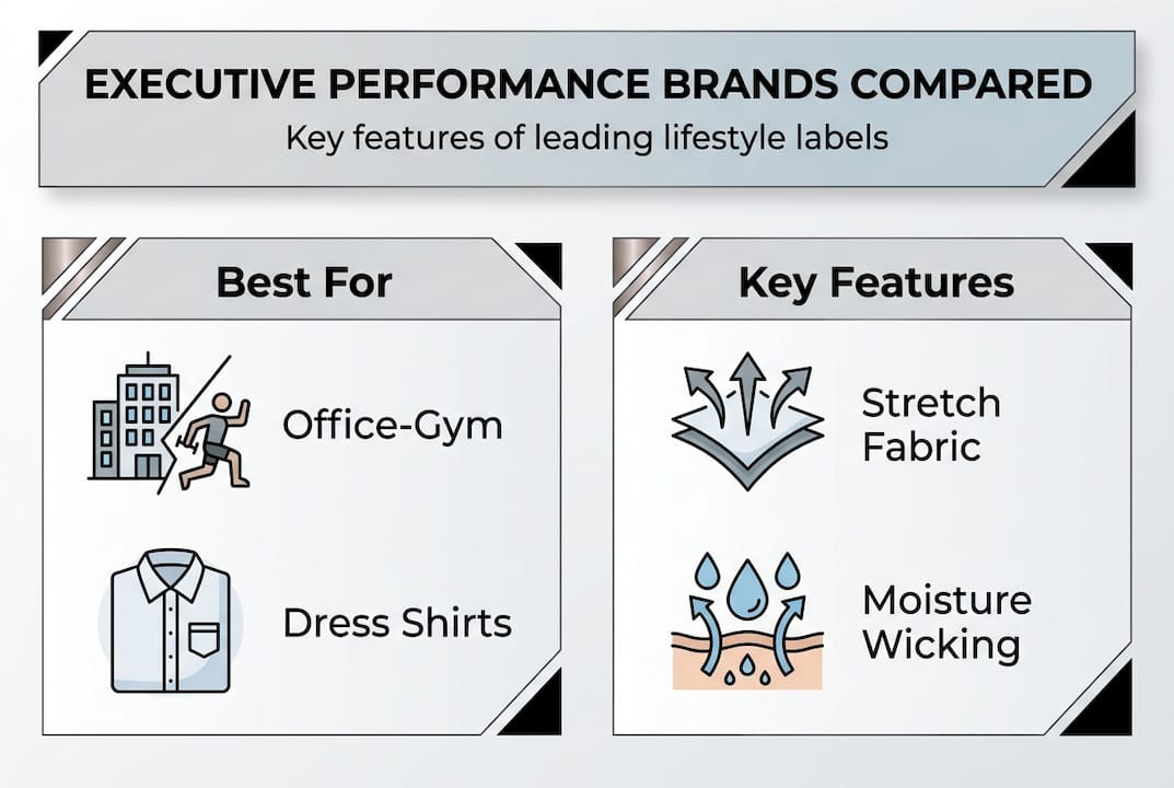 | Multifunctional fabrics | Modern performance brands utilize stretch and moisture-wicking materials for all-day executive use. |