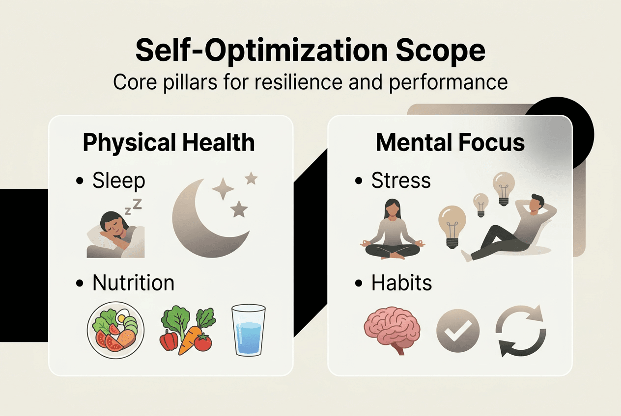 | Self-optimization scope | Encompasses mental resilience, physical health, hormonal balance, and lifestyle routines for sustainable performance. |