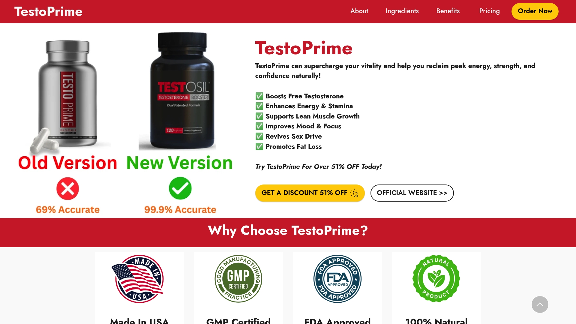 TestoPrime is a natural testosterone booster aimed at men over 30 who want more energy, lean muscle, and improved libido without synthetic hormones. The formula emphasizes safety and consistency and ships from FDA-registered and GMP-certified facilities in the USA.